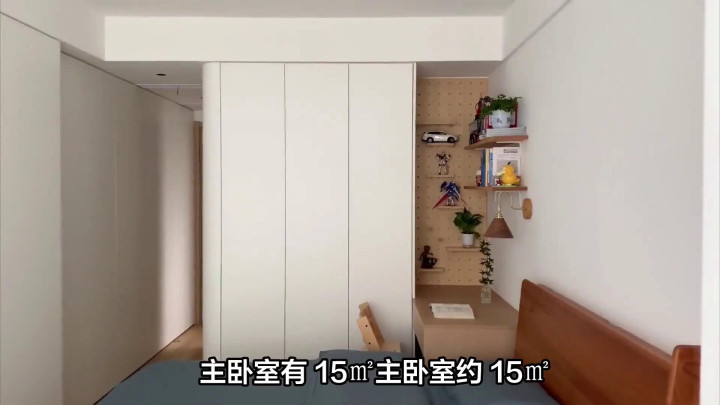 ·主卧室有15m2,主卧室约15m2,进门横向柜子隔出小走廊,柜子后是杂物间。主卧朝南,南北通透,阳光照进,搭配浅色装修,虽面积不大却显宽敞。双人床设半墙背景墙,避免单调,提升层次感。折叠门后的储物间塞满生活用品和家居消耗品,分区收纳,让家整洁有序。