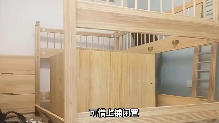 ·北向次卧儿童房玄关柜旁门通向儿童房,虽窗朝北,但采光通风好,装修偏现代风。室内上下铺,下铺双人床,上铺单人床,可惜上铺闲置,梯子都拆了。靠窗L形转角书桌与衣柜相连,利用转角冗余空间放置书本杂物,实用性强。