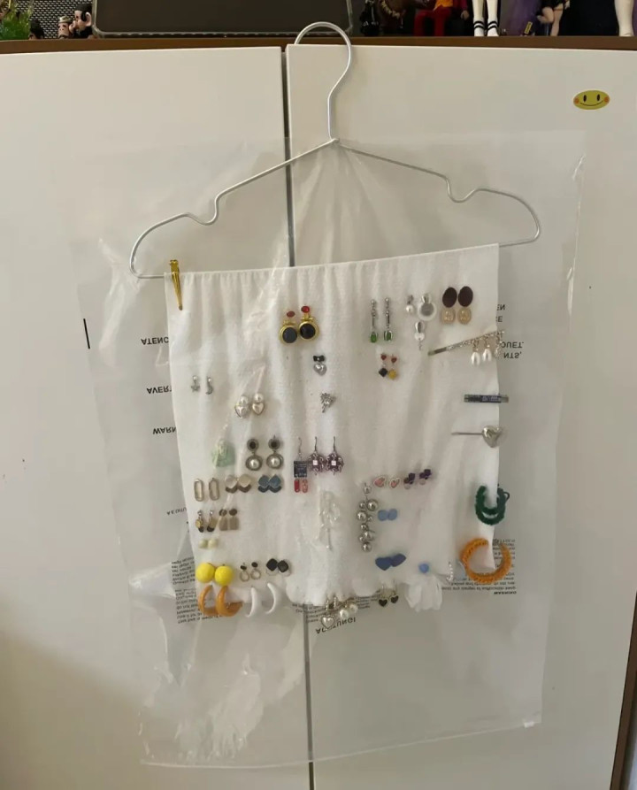 拉链袋是我屯的最多,也是最好用的一种袋子。但我没想到,网友们用一只透明拉链袋、一个衣架、一块洗脸巾居然能制作出很实用的首饰收纳袋,奉上图示: