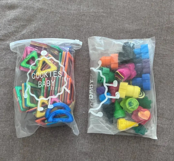 透明拉链袋还可以用来装儿童玩具,比如积木和磁吸的三角板这些小件玩具,全部装袋,既能保护玩具磨损,又方便识别和取放。